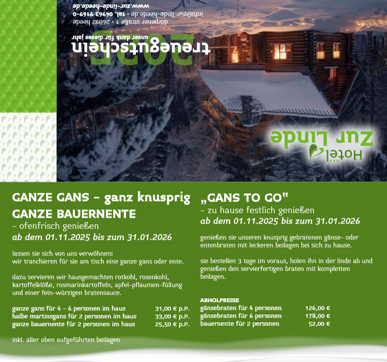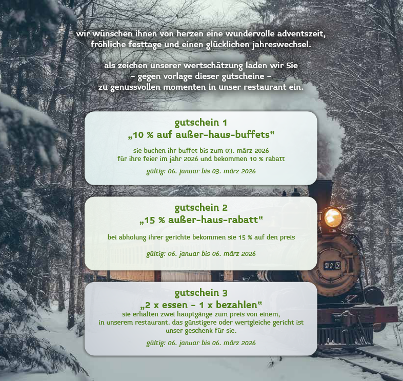 Wir wünschen Ihnen eine wundervolle Adventszeit und frohe Festtage. Als Zeichen unserer Wertschätzung möchten wir uns herzlich für Ihre Treue bedanken und laden Sie ein, Ihren Treuegutschein bei uns einzulösen. Genießen Sie die festlichen momente, feine Speisen und eine gemütliche Atmosphäre, wir freuen uns auf Ihren Besuch. 🙌