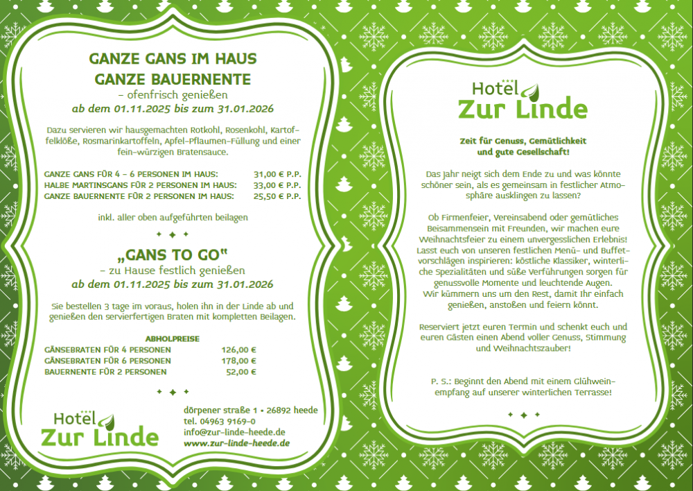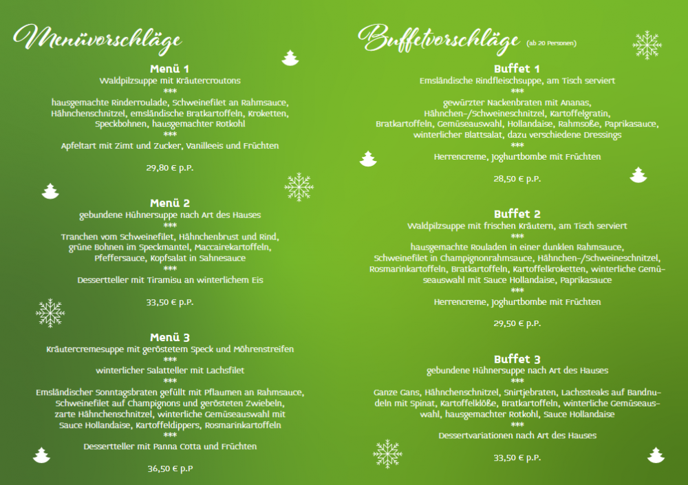 Ob klassisch, regional oder modern, unsere weihnachtlichen Angebote sorgen für Genuss und eine stimmungsvolle Atmosphäre. Perfekt für Firmenfeiern, Vereine oder gemütliche Abende im Freundeskreis. Wir freuen uns Eure Weihnachtsfeier zu einem besonderen Erlebnis zu machen. 🎅